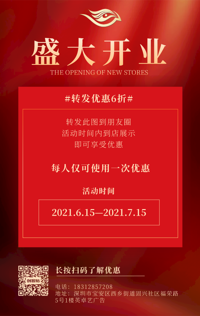 开业在即的前3天,就要开始准备几张开业的海报了;短期使用,如果是粘贴在墙面或玻璃上的,可采用可移背胶材质(不易留胶),如果是比较不平整的地方,可用KT板材质。电子档的图片,还可以用来发朋友圈造势!
