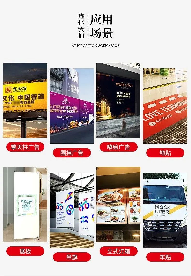 适用于展览、活动会议、发布会、媒体见面会、婚礼策划、新闻主持、户外广告喷绘制作、跨路桥广告牌、工地围挡广告、擎天柱广告等。