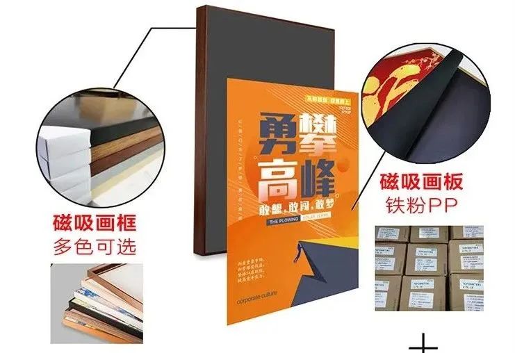 磁性框画。这种是采用磁性材料,把一层磁底贴在墙上,然后把面层吸附到磁底上面。只需将文化墙所要展示的内容喷绘制作在面材上面,然后利用磁吸上墙就可以了。