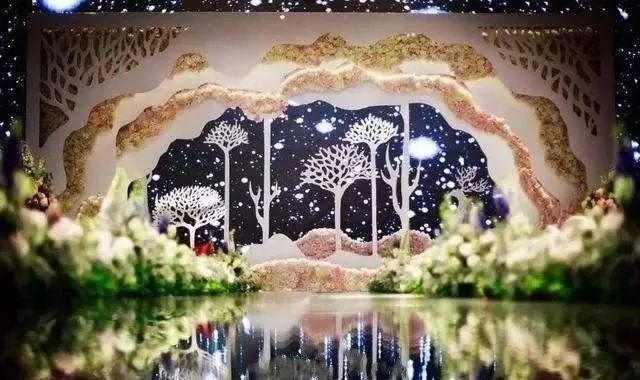 在现阶段的婚礼场景搭建中,桁架与KT板作为最常见的材料,应用极其广泛。桁架因其组合方式多变,能够满足各种尺寸要求,是常规婚礼中最基本的背景支撑材料,与KT板巧妙结合,适合打造多种浪漫的背景墙。