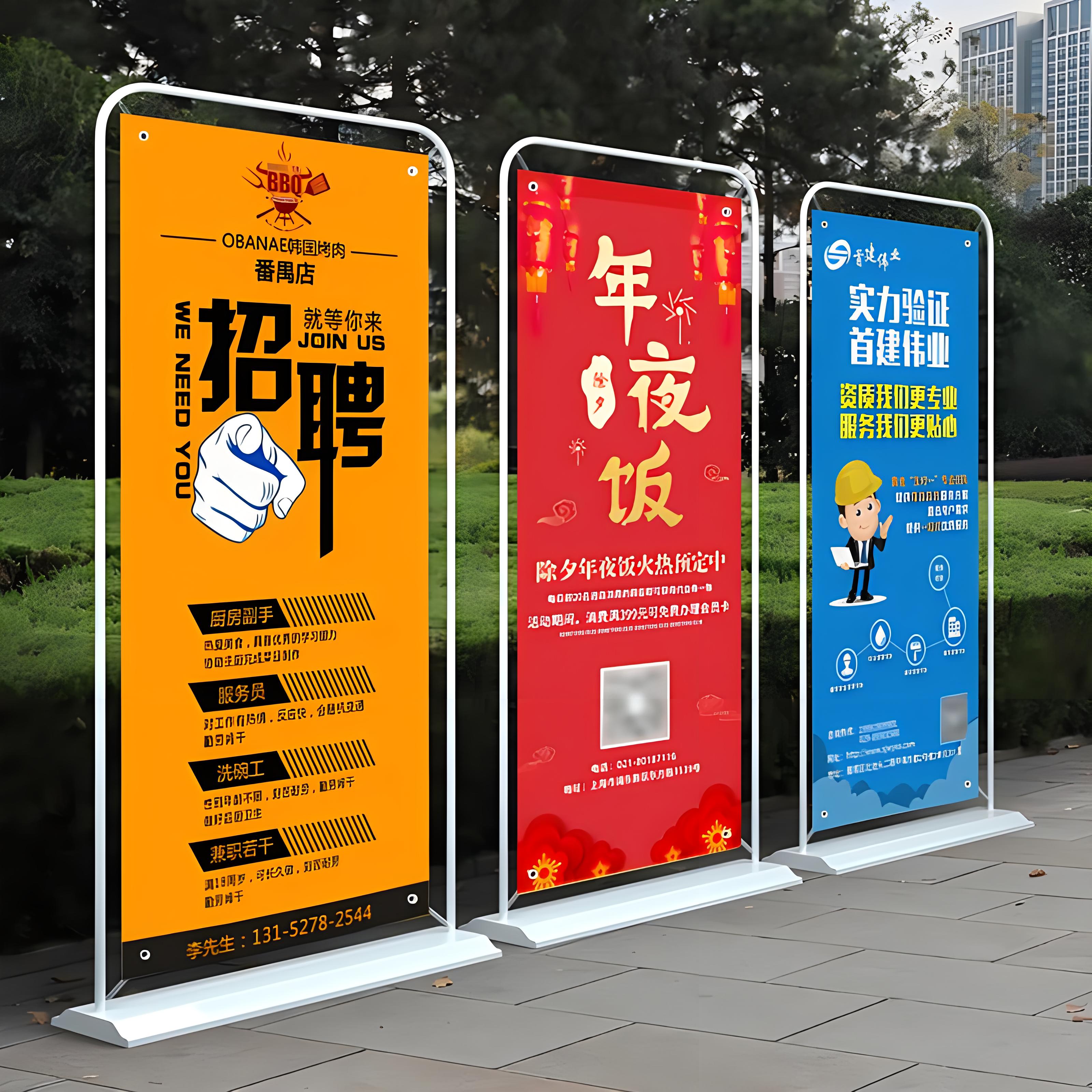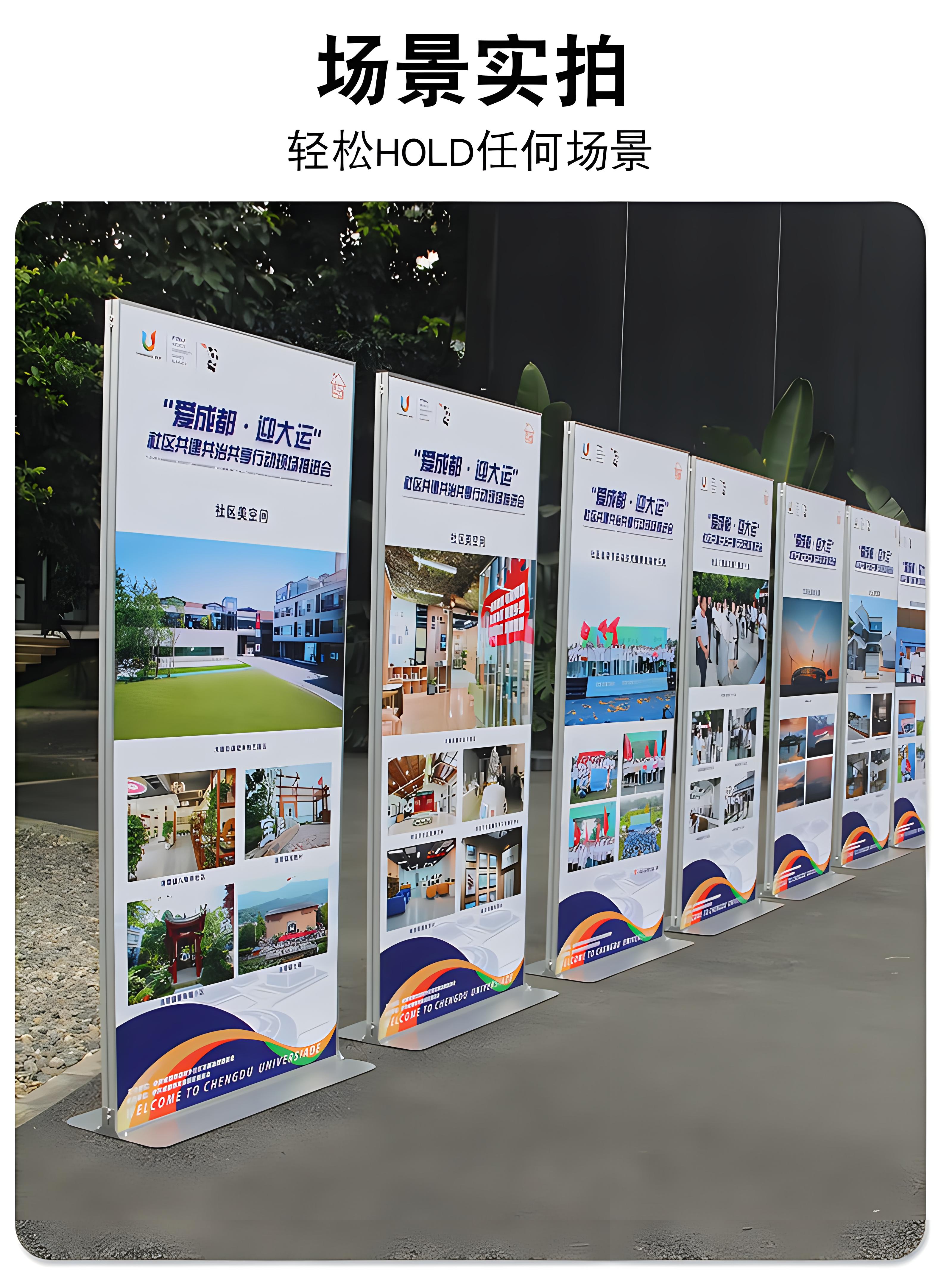 4、挂上宣传材料。这个步骤就是将制作好的宣传材料挂在展架上,注意尺寸需要统一。